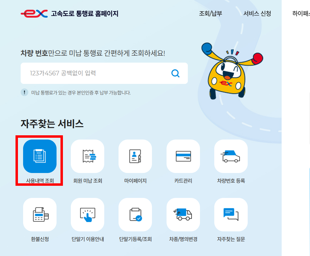 1. 하이패스 이용 후 1~3일 이후 조회 가능