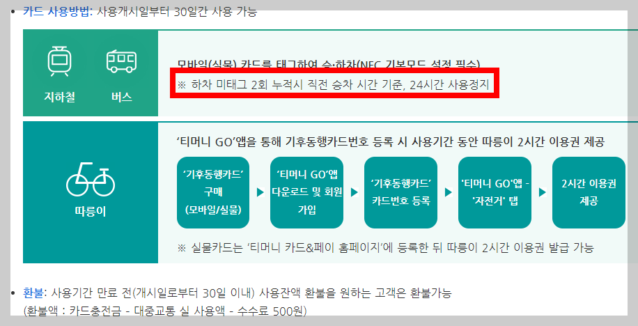 사용 기간 만료 전(개시일로부터 30일 이내)에 사용 잔액을 환불받고 싶은 경우 환불이 가능합니다. 환불액은 카드 충전금에서 대중교통 실 사용액과 수수료 500원을 차감한 금액입니다.