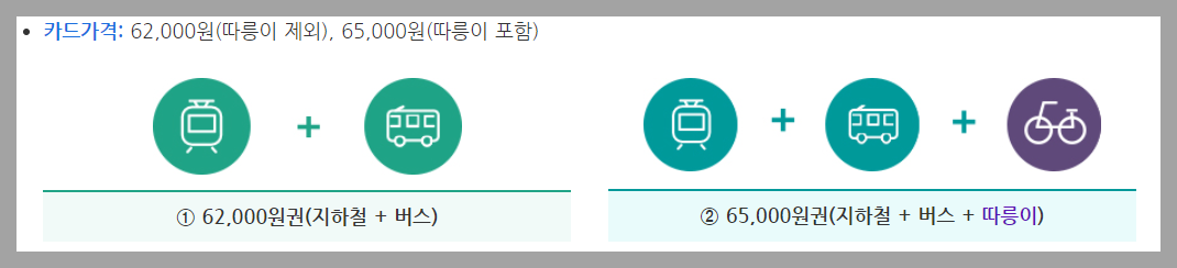 •  지하철, 버스, 따릉이 이용 가능 요금제 : 65,000원