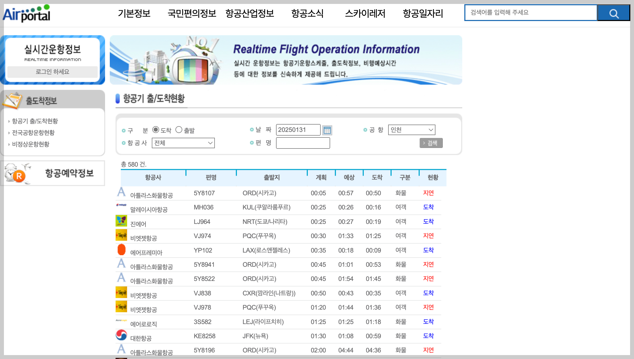 - 출발/도착 현황 페이지에서 항공편 번호 입력 후 조회 가능