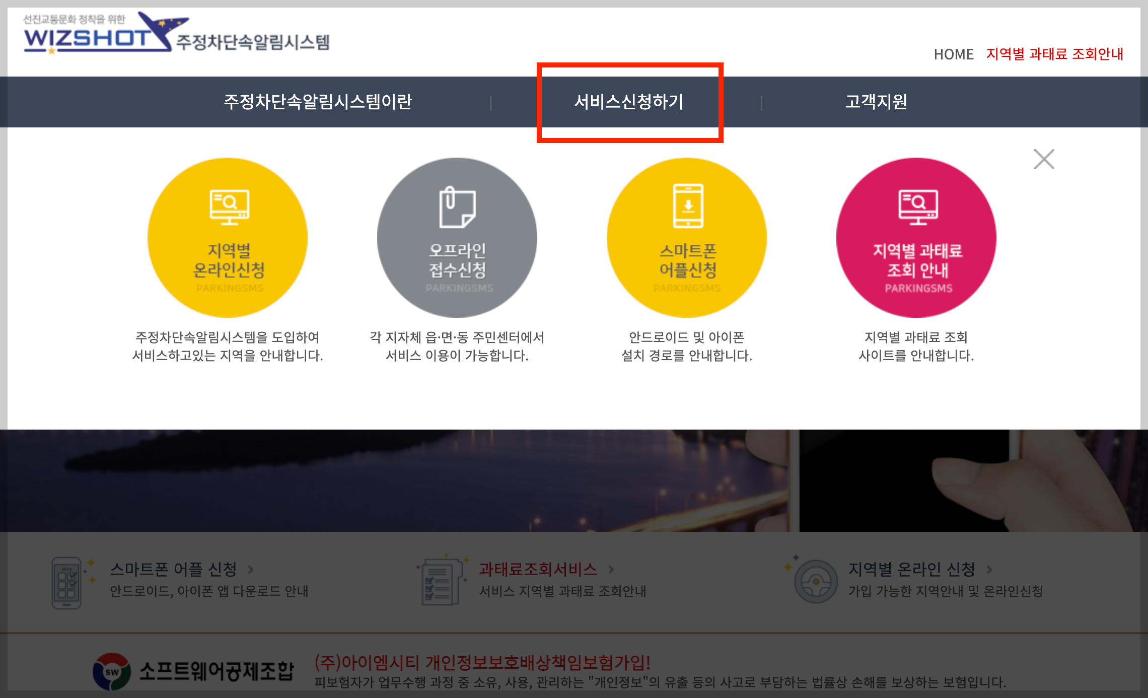 주정차단속알림시스템 홈페이지에 접속합니다. 서비스 신청은 온라인, 오프라인, 스마트폰 앱으로 신청하기가 있습니다.