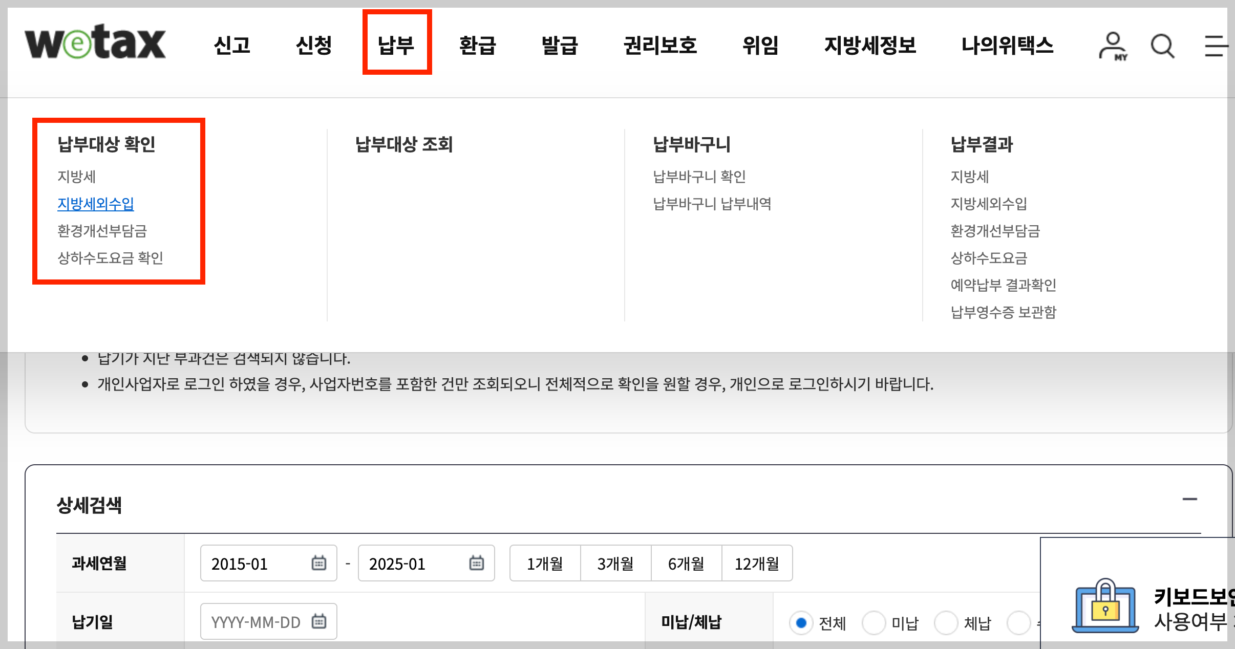 지방 : 납부하기 > 납부대상 확인 > 지방세외수입 클릭 > 차량번호 조회 선택 - 조회