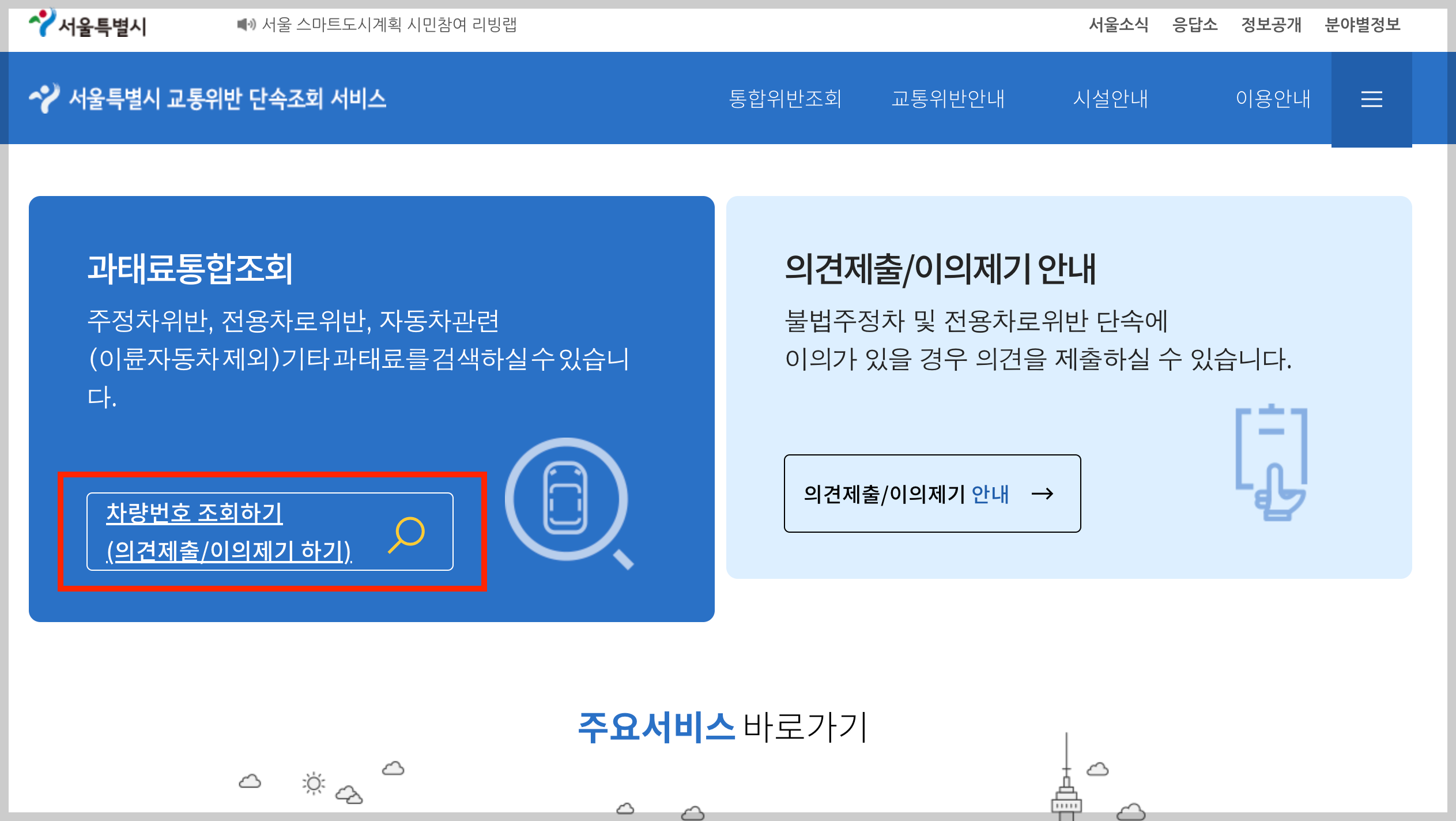 서울 : 서울특별시 단속조회 민원시스템 접속 > 과태료통합조회에서 차량번호 조회 클릭 > 휴대폰 or 아이핀 or 공인인증서 인증 > 조회